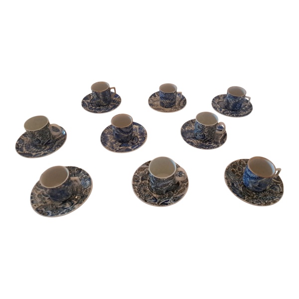 • Nove xícaras para café em porcelana ARS Bohemia nas cores Blue and White,  uma xícara com borda bicada e outra com a asa colada5 x 5 cm.