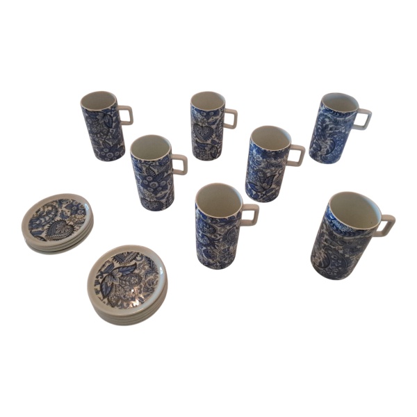 • Sete canecas, e nove descansos para copos, em porcelana ARS Bohemia nas cores Blue and White, 10 x 4, Diam. 9 cm.