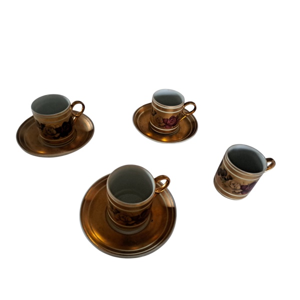 • Quatro xícaras para café, uma sem o pires, em porcelana decorada com rosas sobre fundo dourado, 5 x 5 cm.