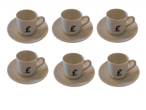 • Seis xícaras para café em porcelana branca monografada `L`.  4 x 4 cm.