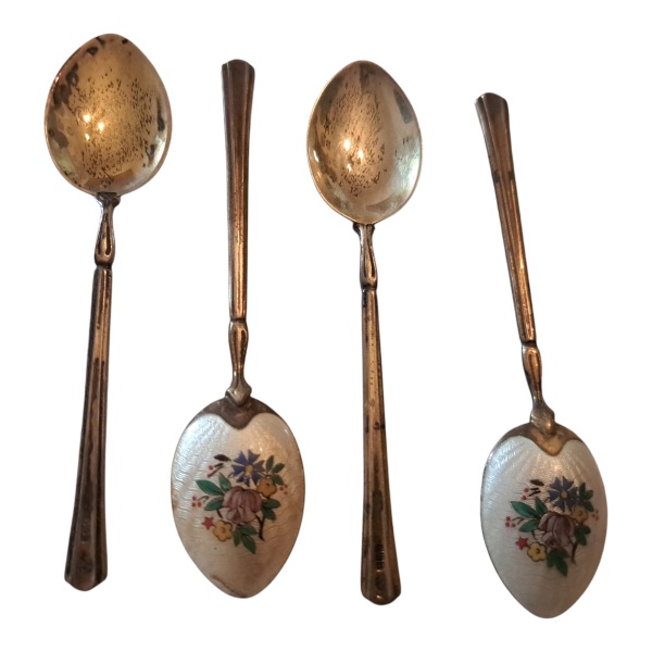 • COLECIONISMO - Quatro colheres  para café  em vermeil e verso  esmaltado em flores.