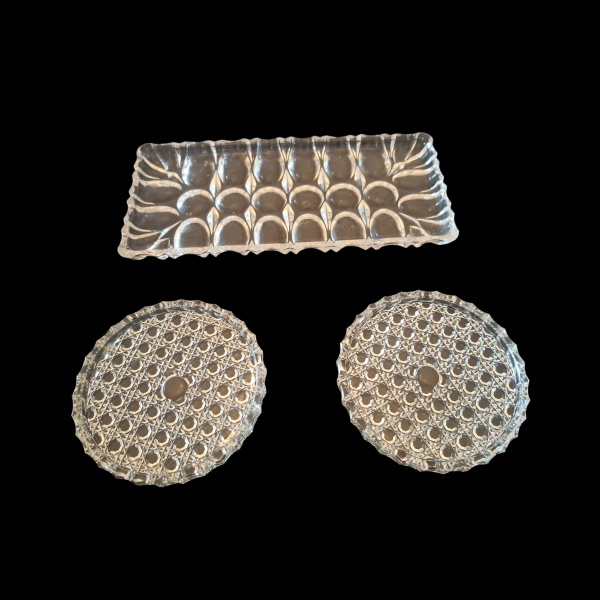 • Três travessas em vidro lapidado, 30 x 15, Diam. 14 cm.