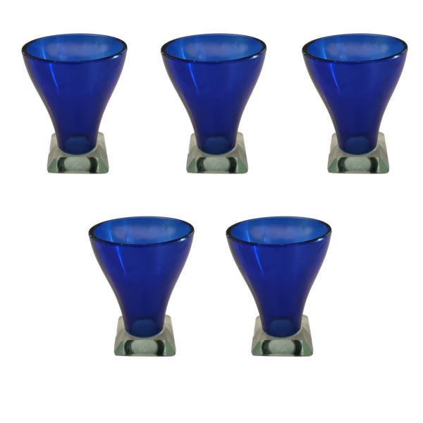 • Cinco taças para aperitivos em cristal na cor azul e base quadrangular translúcida, Alt. 9 Diam. 7 cm.