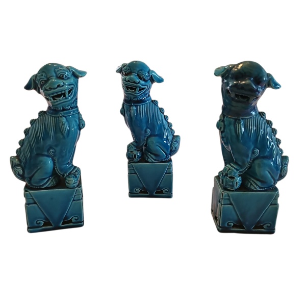 • Terno de caes de fó em porcelana zul, um deles com pequeno lascado em uma das orelhas, Alt. 15 cm.