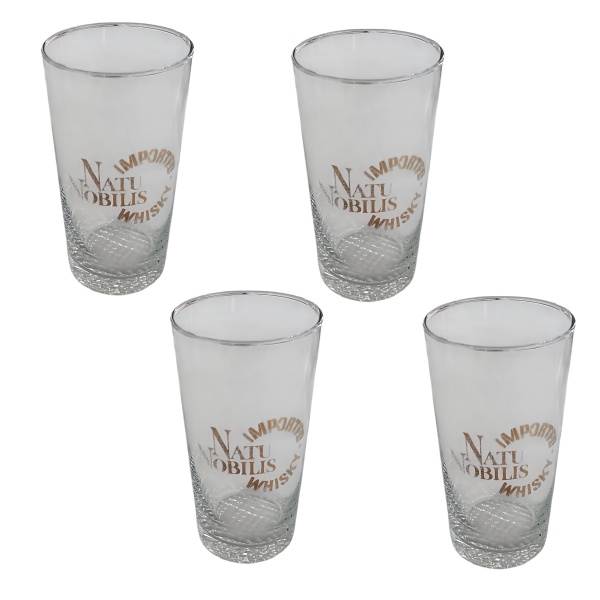 • Quatro copos para whisky longo em vidro com logo Natu Nobilis em dourado, Alt. 14, Diam. 7 cm.