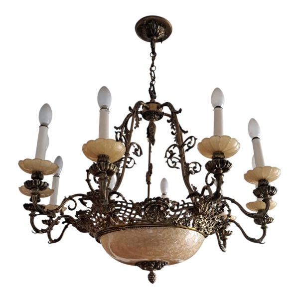• Luminária de teto  guarnição em bronze, doze braços retorcidos, cúpula  e bobebeche em resina com galerias vasadas, Alt. 95, Diam. 71 cm.