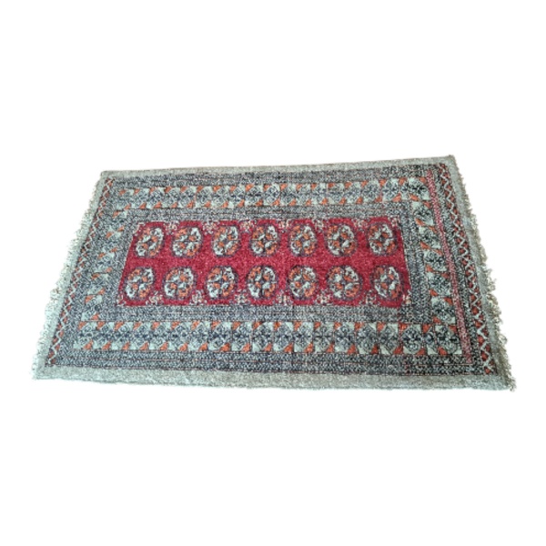 • Tapete persa, nas cores marrom-/preto-/vermelho e etc. franja com marcas do tempo, 154 x 93 cm.