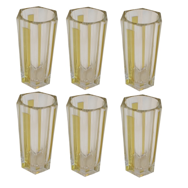 • Seis copos em grosso vidro nas cores amarelo e translúcido, bordas sextavadas, Alt. 14, Diam. 6 cm.