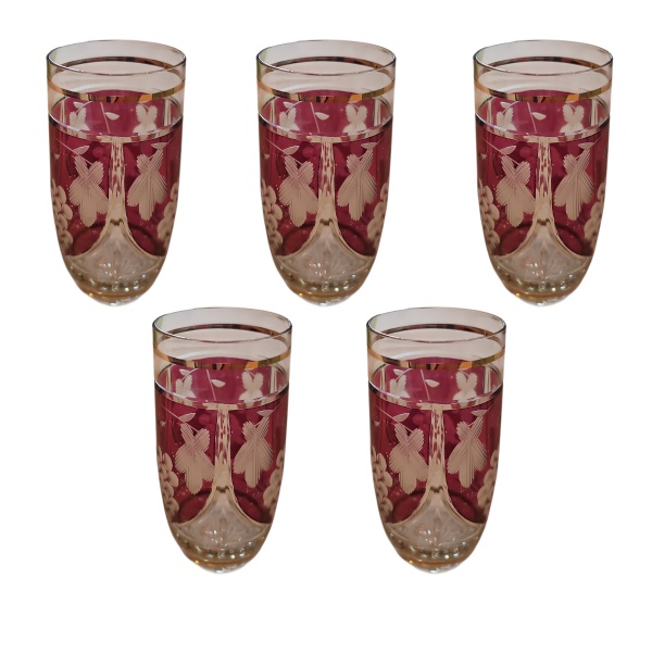 • Cinco copos para água/suco em cristal com lapidação representando uvas sobre fundo vermelho e bordas douradas, Alt. 14, Diam. 6,5 cm.