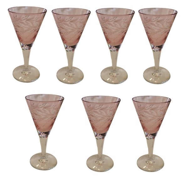• Seis copos para aperitivos em cristal rosa lapidado, Alt. 8, Diam. 6 cm.