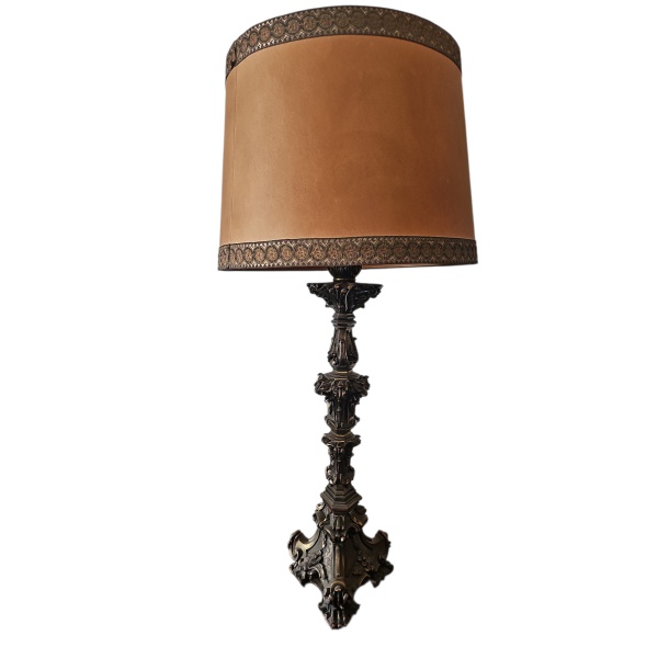 • Tocheiro entalhado em resina patinado na cor bronze, antiga cúpula em pergaminho, Alt. 100 cm.