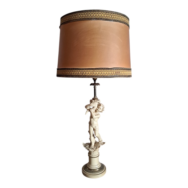 • Luminária para uma luz em resina representando querubim sustenadandoi grande cúpula antiga  em pergaminho, Alt. 103, Diam.  41 cm.