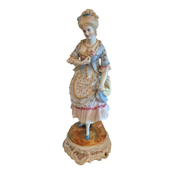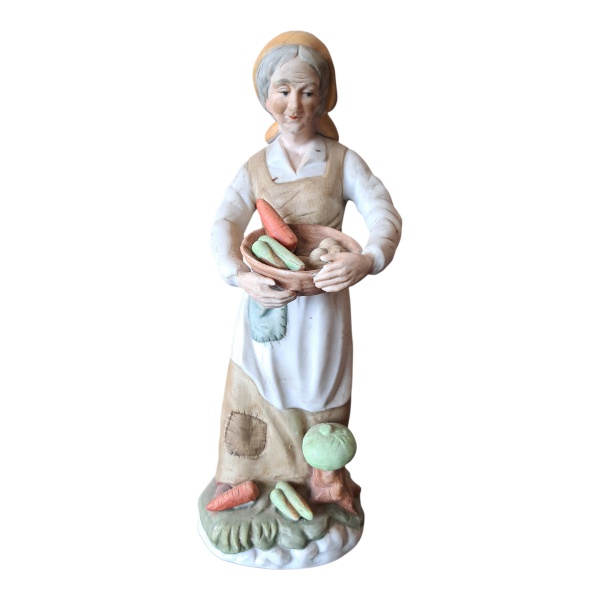 • Escutório em cerâmica europeia policromada representando camponesa com os legumes, os dedinhos de ujma das mãos estão quebrados,  11 x 7, Alt. 30 cm.