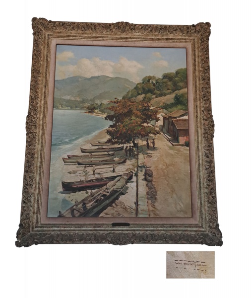• OST - WEIGEL, Rodolfo,Representadno Vila de Pescadores, acid e datado 1951, Um dos maiores  e respeitados paisagistas de casarios, nascido na Áustria 1907 e passou a maior parte de sua vida no Brasil, faleceu em 1987, 63 x 80 e 86 x 104 cm.