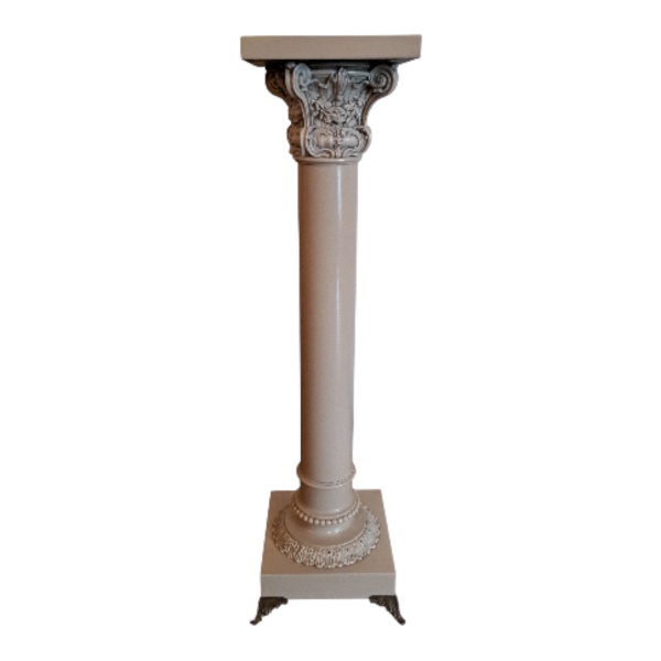• Coluna em resina com tampo quadrangulat sustentada por coluinata esculpida apoiada em pés de bronze,  26,5 x 26,5, Alt. 107 cm.