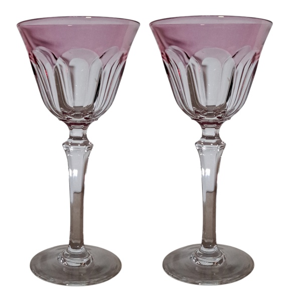 • Par de taças em cristal trasnlúcido e rosa, lapidação dedão, Alt. 18, Diam 8,5 cm.