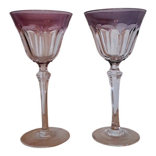 • Par de taças em cristal trasnlúcido e lilás, lapidação dedão, Alt. 18, Diam 8,5 cm.