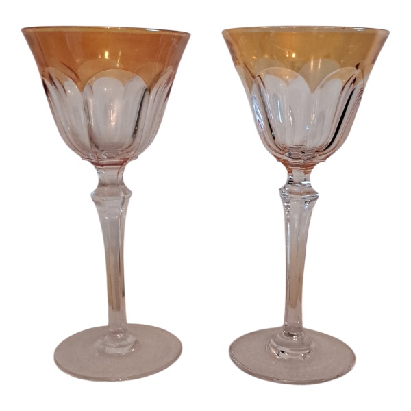 • Par de taças em cristal trasnlúcido e amarelo, lapidação dedão, Alt. 18, Diam 8,5 cm.