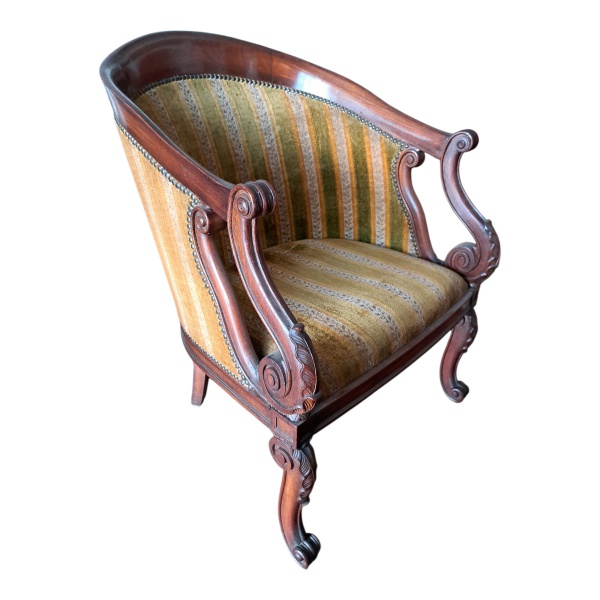 • Poltrona em madeira nobre encostro e  pernas recurvas, estofamneto  em veludo litrado nas cores mostrada e verde musgo, Com. 57 x Prof. 60, Alt.  81 cm.