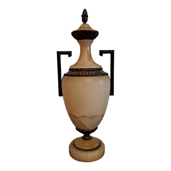 • Ânfora em alabastro com guarnição e pega em pinha em bronze, tampa apresenta rachado e bicado, Alt. 45, Diam. 15  cm.