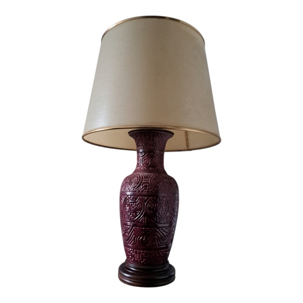 • Vaso em porcelana oriental lavrado em alto relevo na cor vinho adaptado para luminária de uma lâmpada com cúpula de pergaminho e apoiado em peanha de madeira, Alt. 81, Diam. 38 cm.