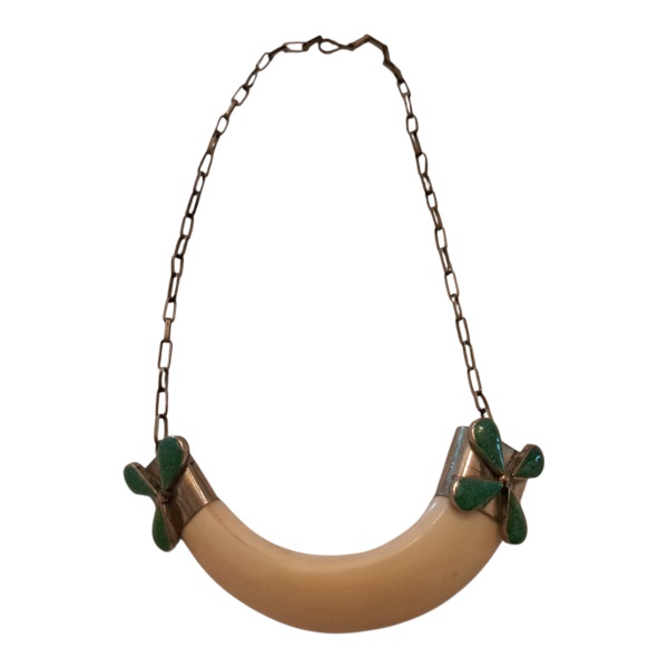 • Gargantilha  executada com pedantife em dente de javali encastoada em  metal prateado adornada com quartzo verde, falta uma pedra.