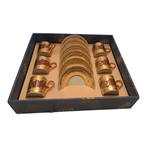 • Seis xícaras para café com pire em porcelana decorada com rosas sobre fundo dourado, em sua embalagem original, 5 x 5 cm.