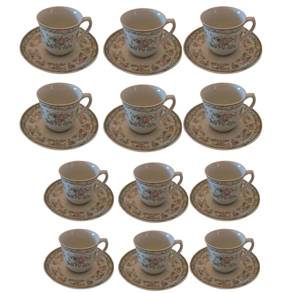 • Doze xícaras para chá em porcelana Real policromada com delicadas flores sobre fundo branco.