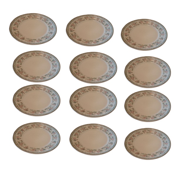 • Doze pratos para sobremesa em porcelana Real policromada com delicadas flores sobre fundo branco, Diam. 19 cm.