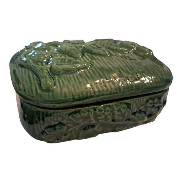 • Porta joias em cerâmica com folhas e flores em alto relevo na tampa, frente e verso  na cor verde, 17 x 11, Alt. 7 cm.