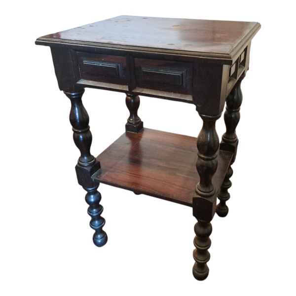 • Mesa de cabeceira/apoio em madeira nobre saia almofadada sustentada por colunatas de balaústre arrematada por uma prateleira, tampo apresenta manchas, uma das colunatas marca de tinta branca, 40 x 50, Alt. 58 cm.