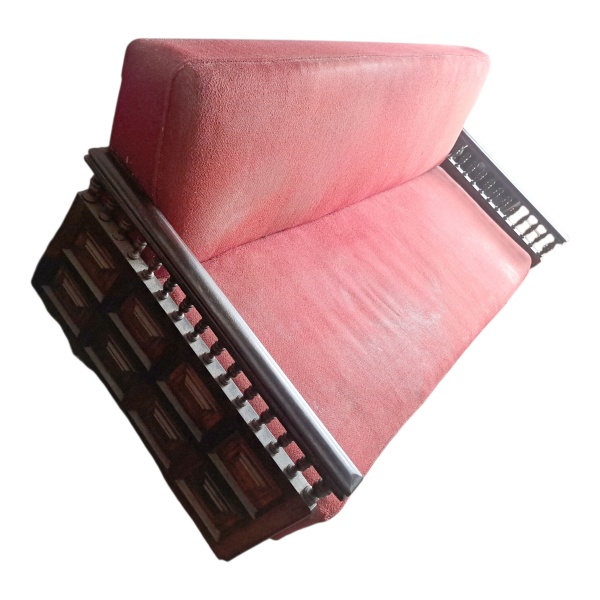 • Sofá em madeira nobre , braços sustentados por  colunatas, pernas torneadas, assento em forração com marcas de muito uso, 200 x 80, Alt. 87 cm.