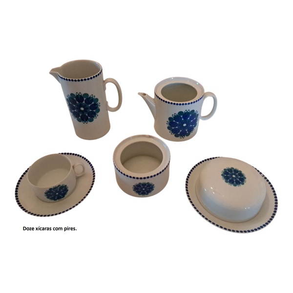 • Guarnição para chá em porcelana Schmidt decorado com flores e bordas peroladas, composto de:   12 xícaras com pires,.1 bule ( bico bicado e sem a tampa), 1 cremeira, 1 manteigueira, 1 açucareiro sem tampa com leve bicado e sem a tampa,