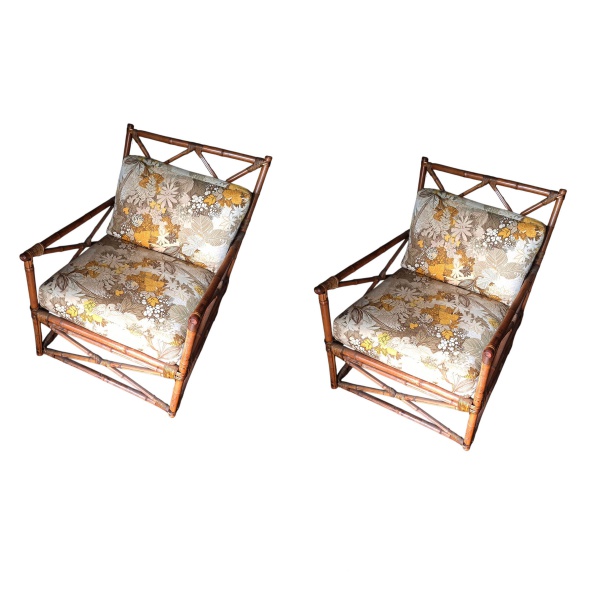 • Par de poltronas em cana da índia, acompanham almofadas e encosto estampados, necessitam higienização, 72 x 73, Alt. 83 cm.