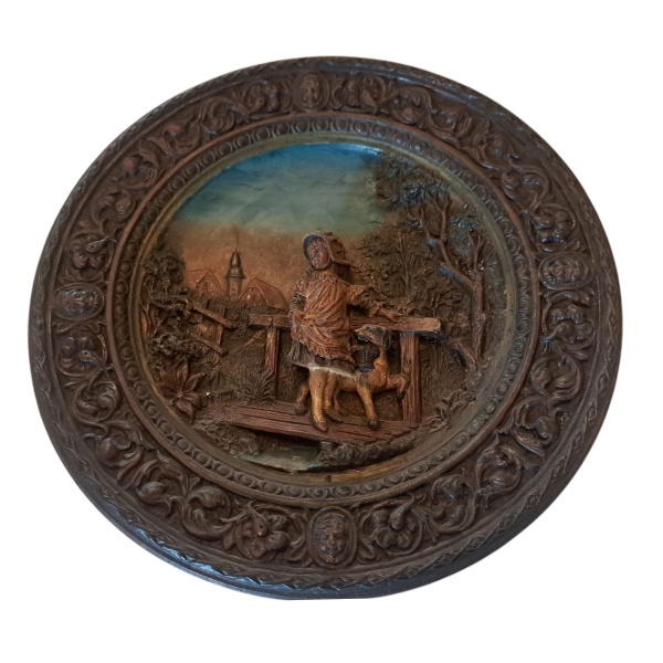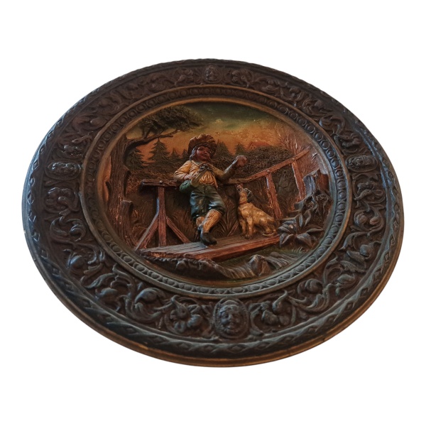 • COLECIONISMO - Prato executado em resina policromada representando menino e seu cão, Diam. 29 cm.