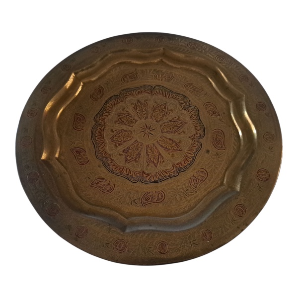 • COLECIONISMO - Prato árabe em bronze repuxado e lavrado em arabescos, Diam. 38 cm.