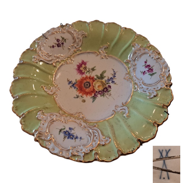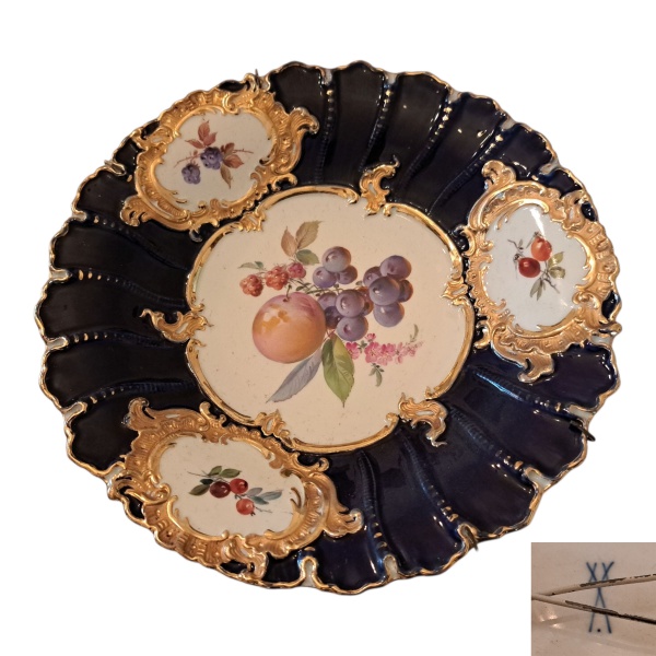 • COLECIONISMO - Antiga travessa em porcelana alemã Meissen com motivos de frutas e brasões dourados sobre fundo brilhante com esmalte azul verde, marcado no verso, Diam. 28 cm.