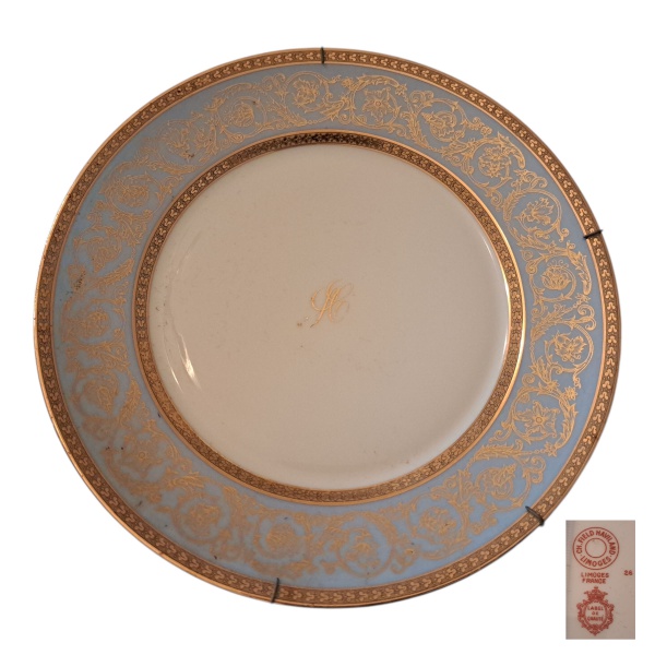 • COLECIONISMO - Prato em porcelana Limoges CH Field Haviland, com galeria azul e dourado monografado ao centro, marcado e numerado no verso, Diam. 25 cm.