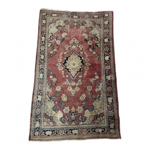 • Tapete persa com marcas de uso e do tempo, no estado, nas cores  vinho/marrom/creme e etc. 220 x  133 cm.