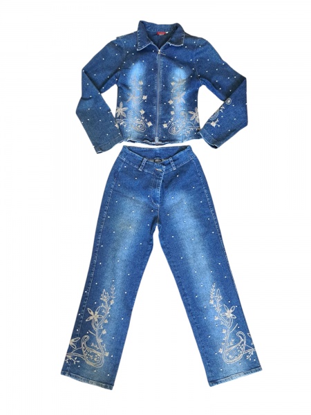 • Calça e jaqueta Jeans feminina, Tam. M. com elastano by Jorane Rabello Tam. M. jaqueta bordada na frente e verso e calca na parte inferior, Cintura 60, Com. da calça, 90,  ombro: 38, Com. 50 cm.