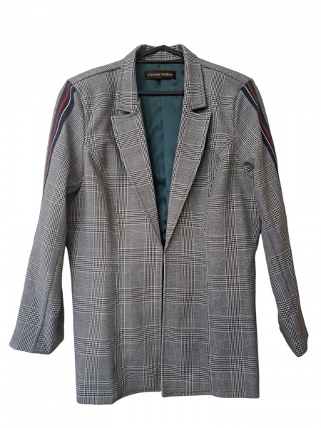 • Blazer feminino Tam. M. by Carmem Steffens xadrez, príncipe de Galles manga com faixa e verso com faixa e estampa bordada floral, ombro 41, Com. 66 cm.