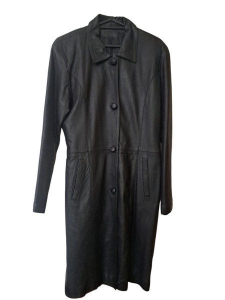 • Sobretudo feminino em couro preto com 2 bolsos e 4 botões laterais, by Bag Pack , apresenta dano na manga, ombro 40, Com. 96 cm.