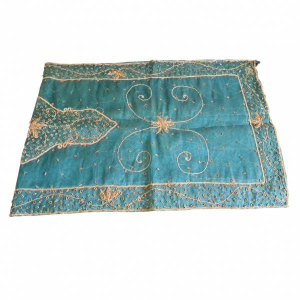 • Caminho de mesa indiano em cambraia bordado com vidrilhos,  140 x 48 cm.