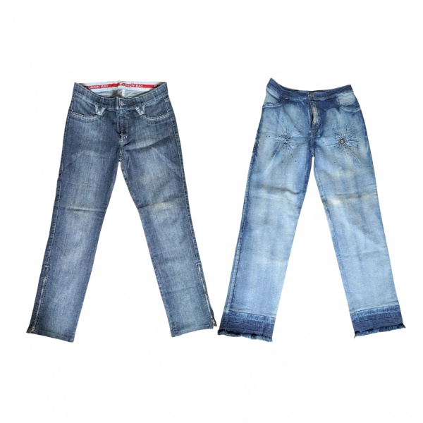 • Duas calças jeans com elastano, femininas, Tam. 46, Laço que Faço, bordada nas pernas com strass e Union Bay com bolsos frontais e traseiros  decorados com strass, Cintura 86 e 76, Com. 104 cm.