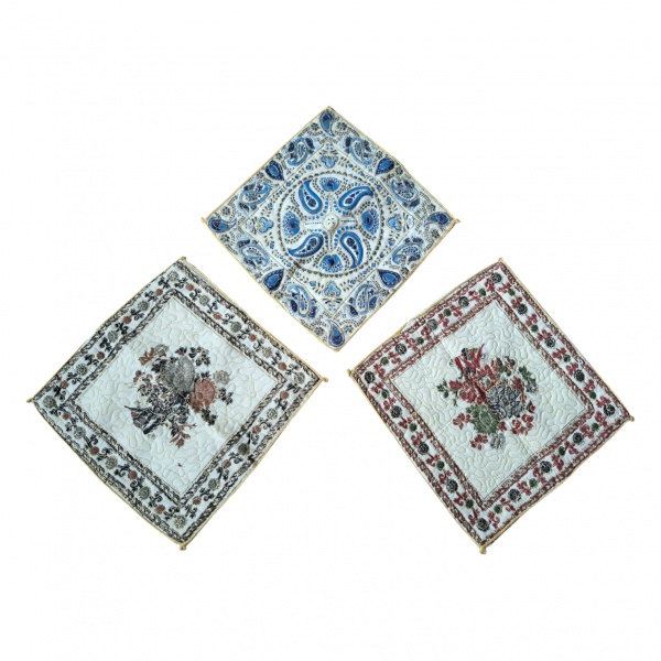 • Três capas para almofadas indianas em tecido bordadas sobre matelassê, fecho éclair, 38 x 38 cm.