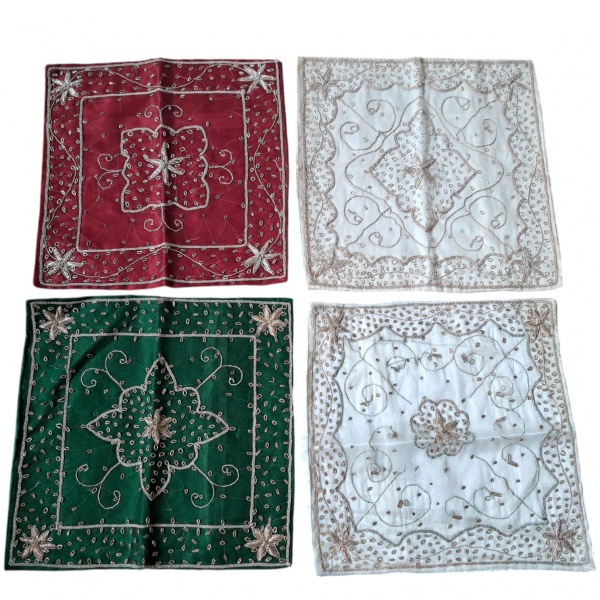 • Quatro capas para almofadas indianas em tecido bordado em pedrarias, fecho éclair, 2 cremes, 1 verde e 1 bordô. 4 x 40 cm.