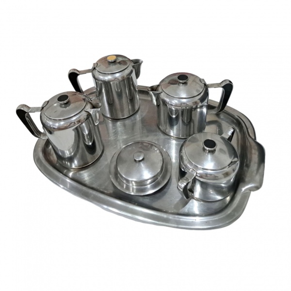 • Baixela em inox  Wolff para chá/café composto de 3 bules, leite/café/chá açucareiro com a colher, 1 manteigueira e 1 bandeja, Alt. 16 a 9 cm, e  50 x 36 cm.