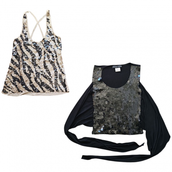 • Uma blusa de manga comprida e uma camiseta pretas com lantejoulas, Locinant e  Angeless, Tam. M.