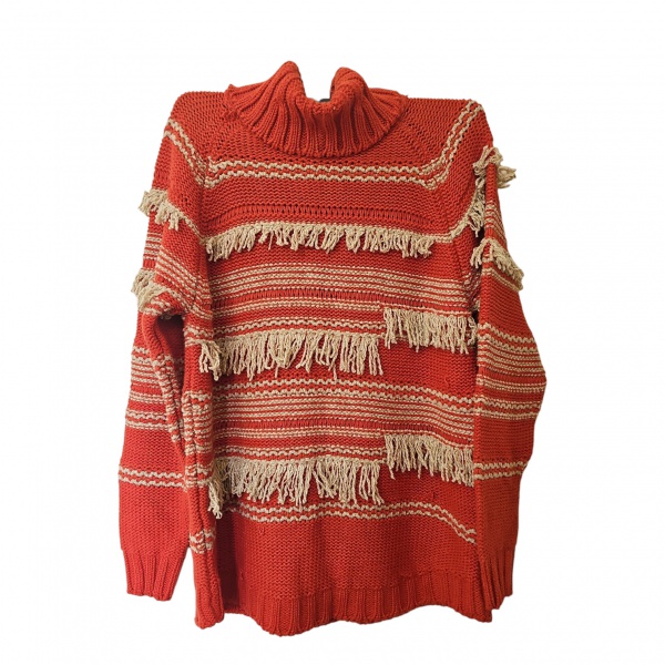 • Blusa em lã manga comprida by Damer na cor ferrugem e creme com franjas e gola rolê, Tam. G,