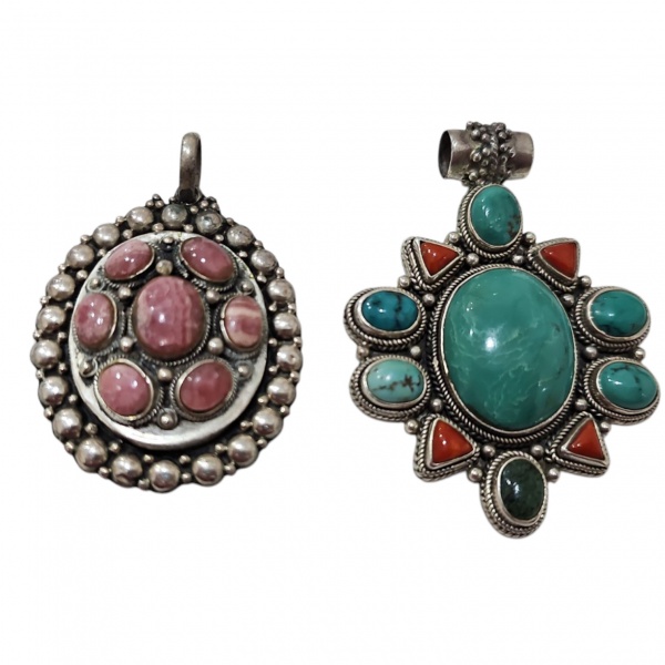 • Dois pedantifes em prata, um deles com coral e turquesa e outro em rodocrosita, 60,7 g. bruto.